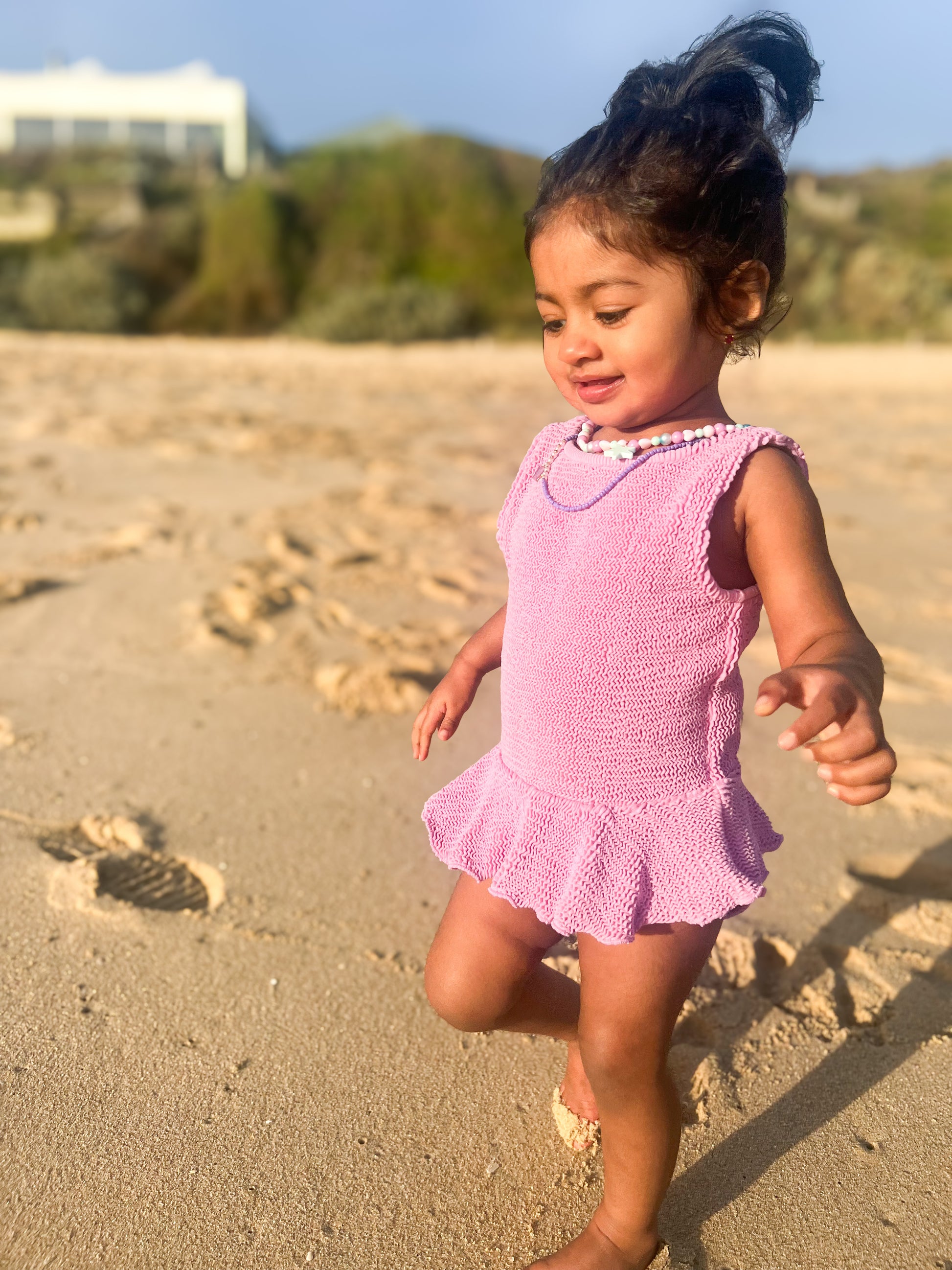 Crafted in soft pastel pink crinkle fabric with a dainty frill waist —