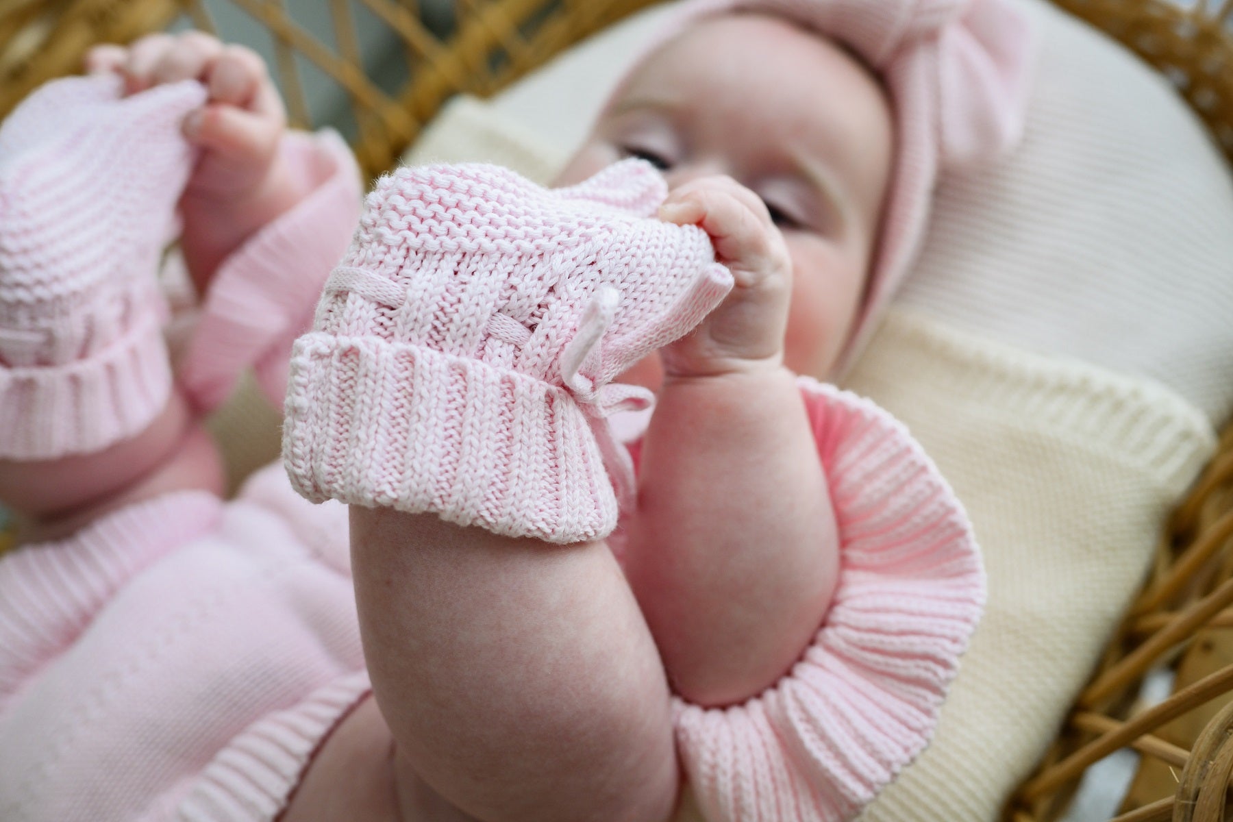 statement frill sleeves and wooden button accents, paired with matching booties and bow